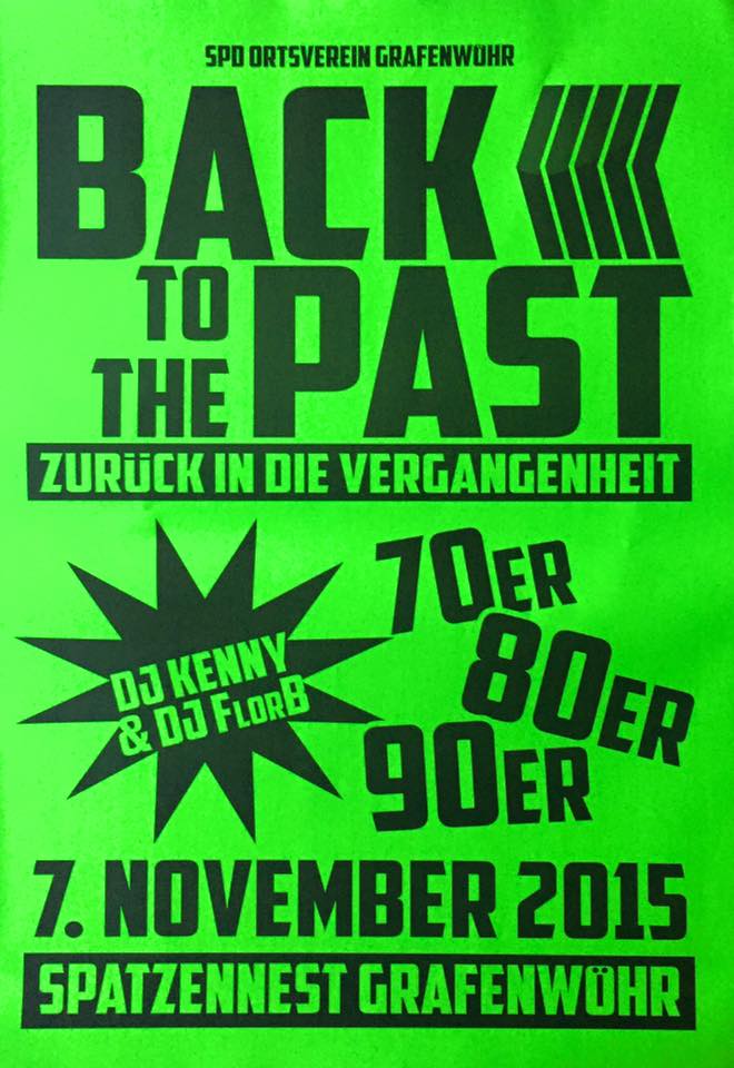 Der SPD Ortsverein Grafenwöhr lädt zur zweiten Runde Plattenparty „Back to the Past“ herzlichst am 07 Nov 2015 im Spatzennest Grafenwöhr ein. Einlass ist 19.00 Uhr und Beginn ist um 20.00 Uhr. Mit Musik aus den 70‘..80‘ und 90‘ heizen Euch DJ Flor B und DJ Kenny wieder so richtig ein. “Let‘s Party, Let’s Groove“ wie in den guten alten Zeiten. Für Getränke ist bestens gesorgt. Eintritt kostet Euro 1,99. Auf Euer Kommen freut sich der SPD Ortsverein Grafenwöhr.